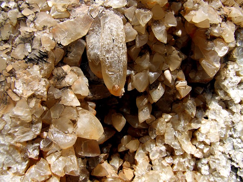 Am Felsenaufschluss neben dem Weg hübsche Calcitkristalle. Ich kann sie mangels Werkzeug leider nicht mitnehmen.