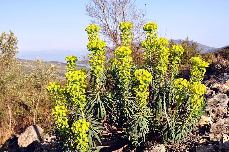 Palisadenwolfsmilch (Euphorbia characias) am Straßenrand.
