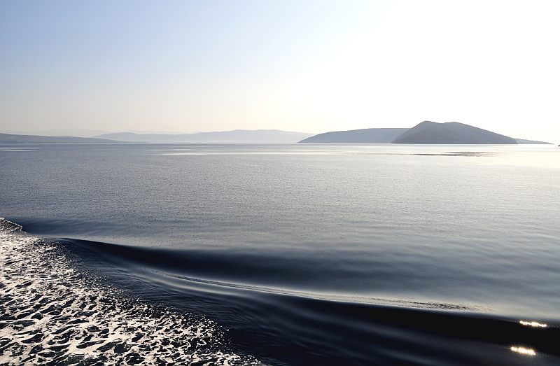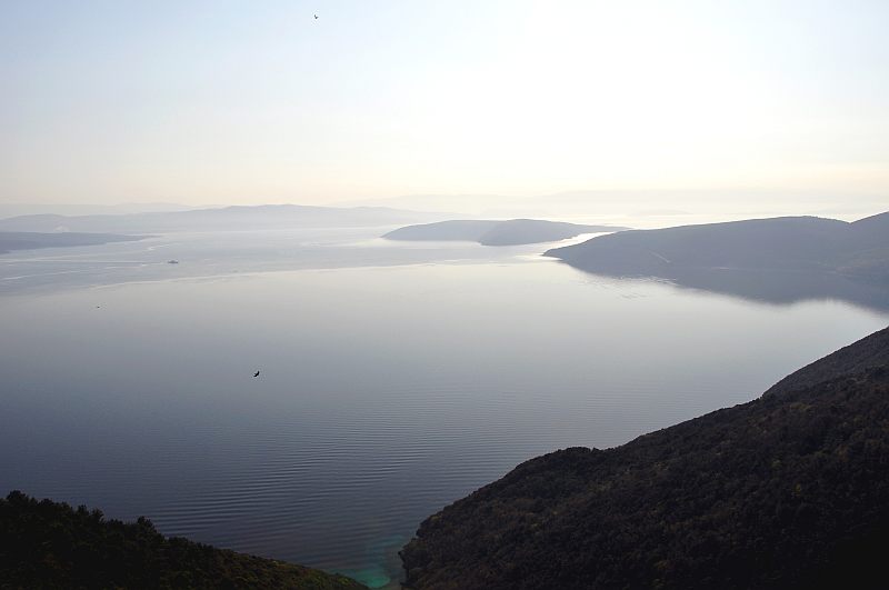 Links die kleine Insel Plavnik, im Hintergrund Krk, Rab und im Dunst das kroatische Festland.