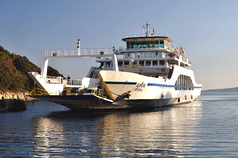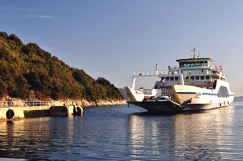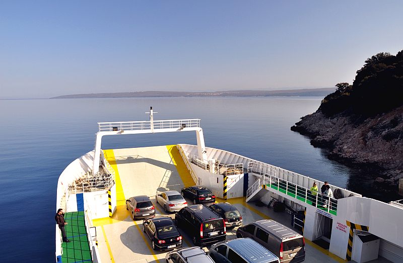 Die Abzweigung nach Merag habe ich vorerst übersehen, was ich aber sehr bald bemerke. Dafür hier dieser Tiefblick auf die Bucht von Merag und das herannahende Fährschiff.