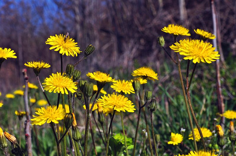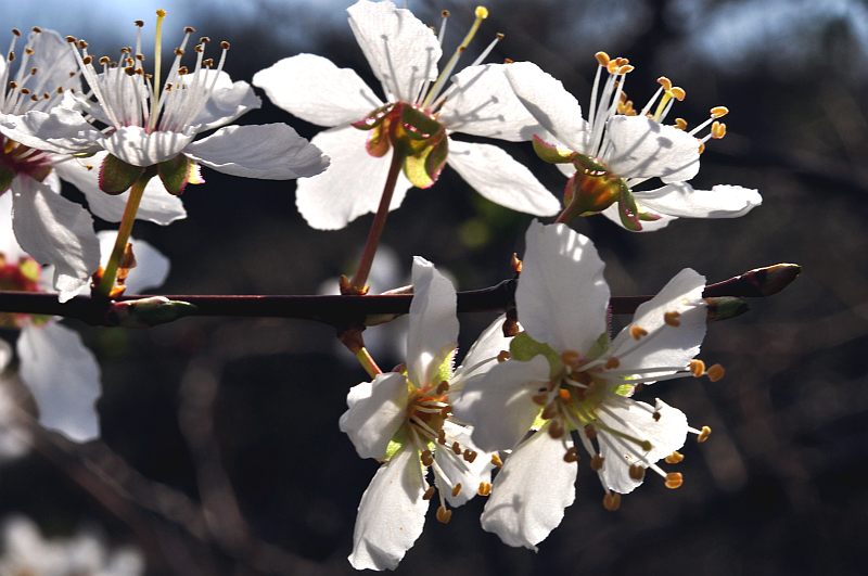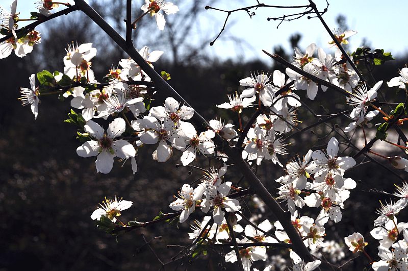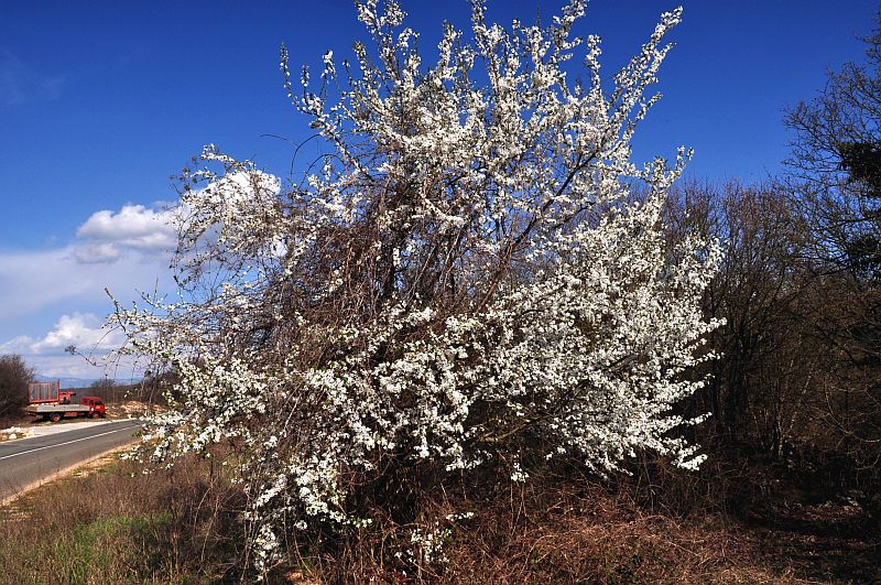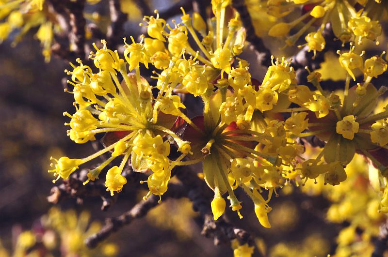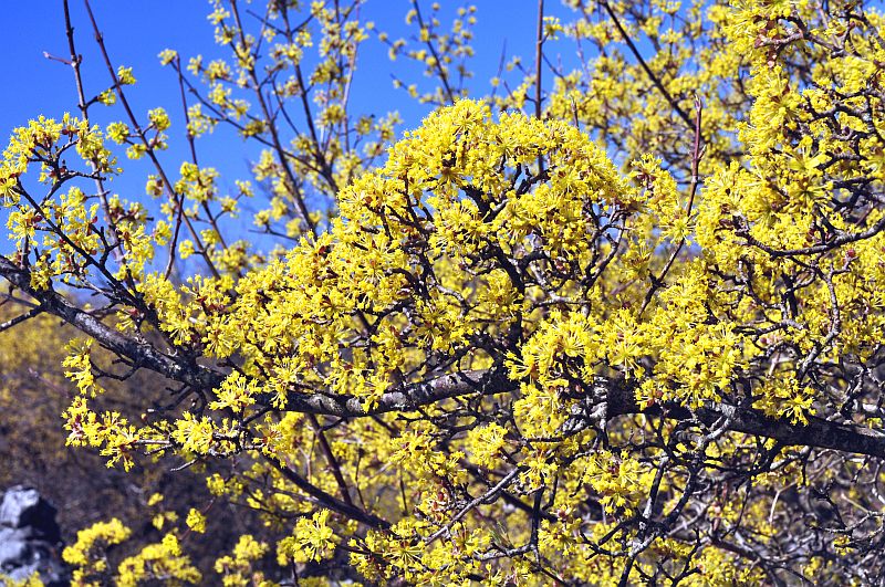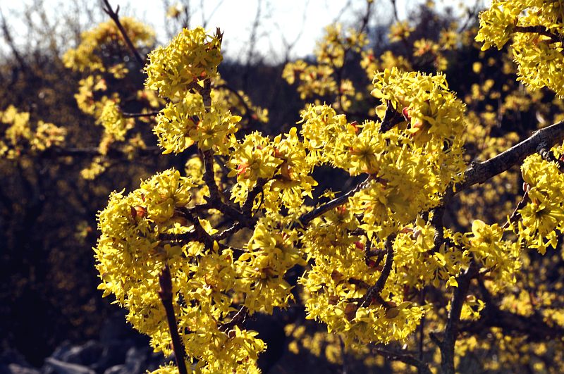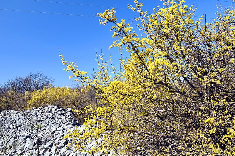 Wieder auf der Hauptstraße. Zwischen Steinmauern wachsen aus der Heimat gut Bekannte: prächtig blühende Dirndlsträucher (gelber Hartriegel, Kornelkirsche, Cornus mas)