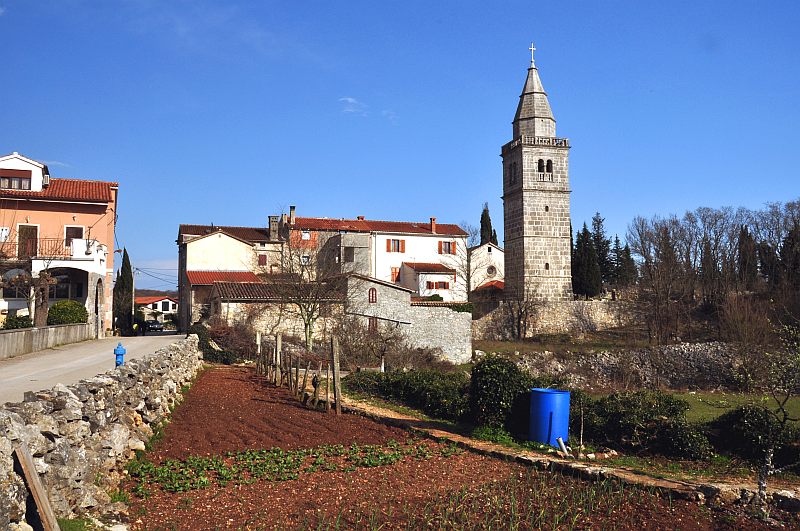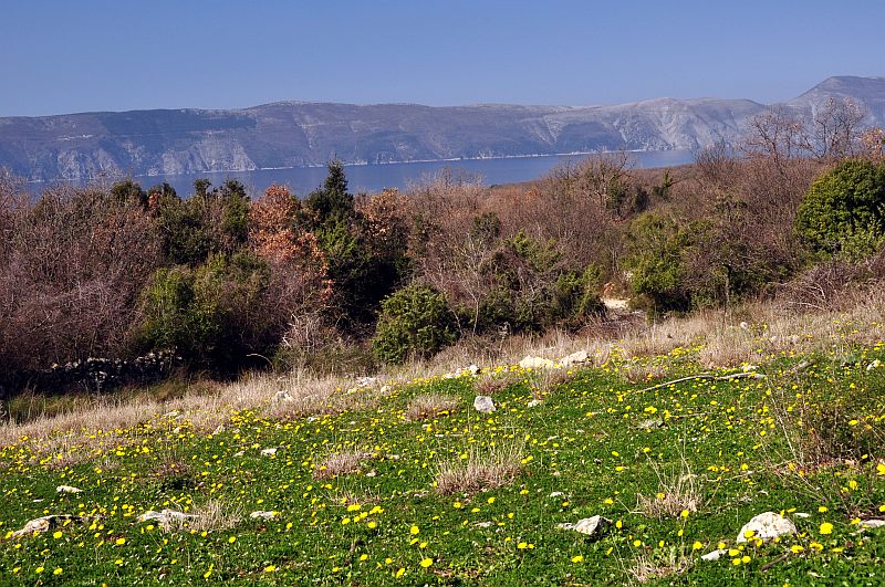 Ich fahre nun bis zur Ortschaft Kosic, den Nachbarort von Vrh und beschließe dort spontan, einem Wegweiser nach Sabljici zu folgen, einer Ortschaft die wieder an der Hauptstraße nach Valbiska liegt. Unvorsichtigerweise folge ich der Angabe und lande auf einem holprigen Wanderweg, der mich über Stock und Stein und zuletzt steil bergab wieder zur Hauptstraße führt. Beiden vielen, nicht bezeichneten Abzweigungen habe ich natürlich die eigentliche Route bald verloren, aber zum Glück finde ich immer wieder einen Weg, indem ich mich an den Himmelsrichtungen orientiere. Unterwegs hinter Steinmauern wieder Sternanemonen.