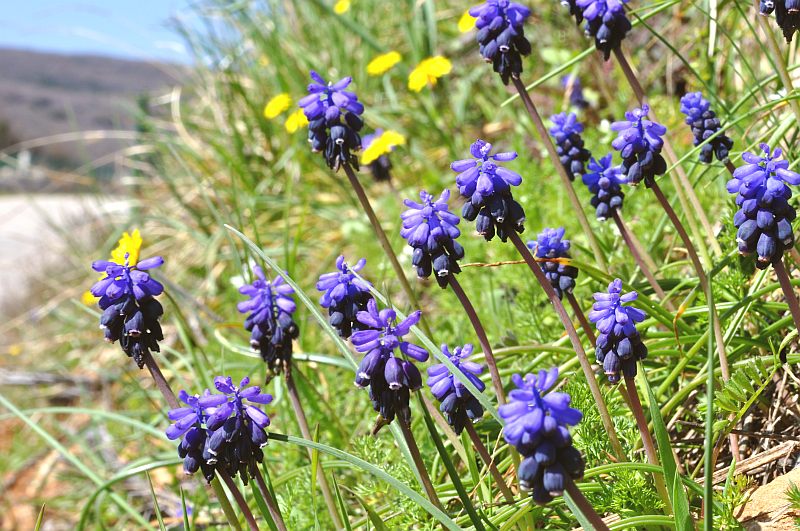 Dunkle Traubenhyazinthen (Muscari commutatum) auf der Straßenböschung.