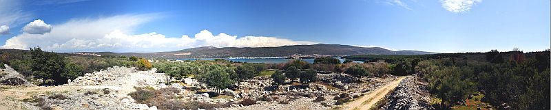 Panoramablick über die Krk östlich benachbarte Bucht von Punat. Hierher oder ins Bild klicken für eine größere Darstellung.