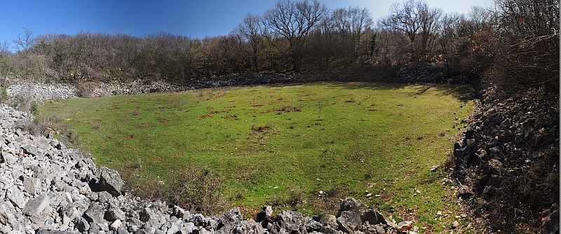 Ich fahre nun wieder ins Innere der Insel und durchquere die wellige Hochfläche. Im Kalkgebirge zahlreiche Dolinen, typische Karsterscheinungen: Einbruchsbecken, die danach mit Sediment gefüllt wurden, hier als kleine, nahezu kreisrunde, flache Weidefläche mitten im Wald. An anderen Stellen sind solche Dolinen aber auch viel größer und am Grund oft mit Feldern bedeckt. Hierher oder ins Bild klicken für eine größere Darstellung.