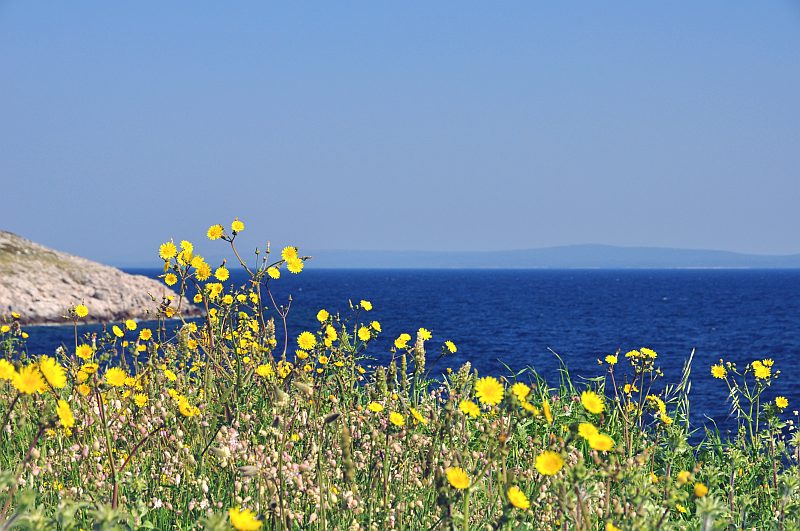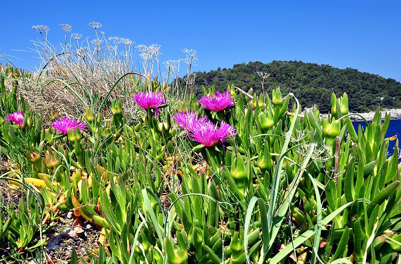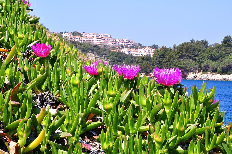 Mittagsblumen überziehen hier den ganzen Hang. Im Hintergrund die Häuser von Mali Losinj