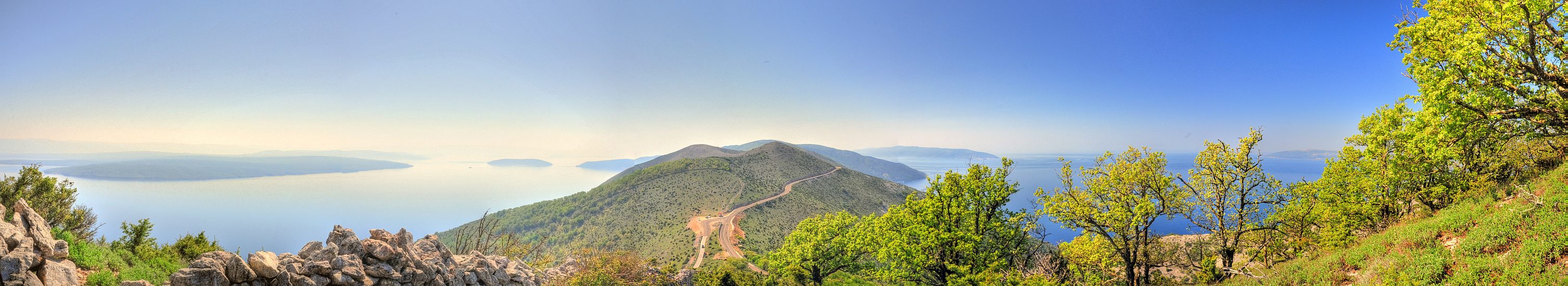 Panoramic view to the south from half way up. In the background to the left the isle of Krk. Spot the ferry on its way between Cres and Krk.