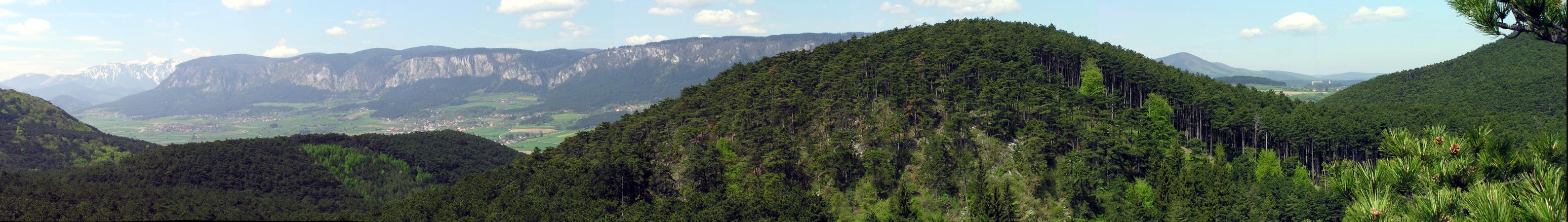 Schneeberg und Hohe Wand, ganz rechts Durchblick nach Dreistetten und die Burgruine Starhemberg.
