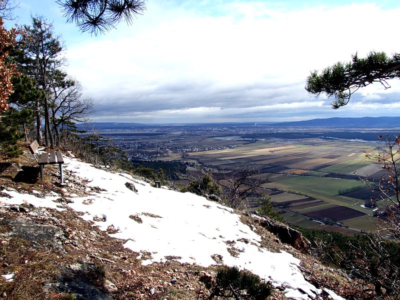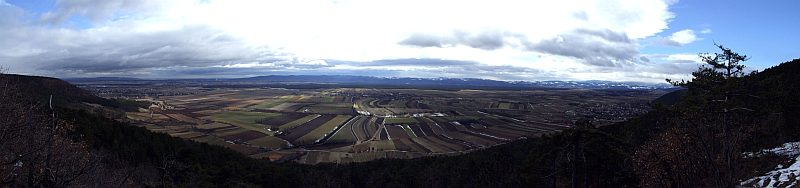 Panorama des südlichen Wiener Becken (Steinfeld) von unterhalb des Muthmannsdorfer Marmorsteinbruchs aus gesehen. Hierher oder ins Bild klicken für eine größere Darstellung.