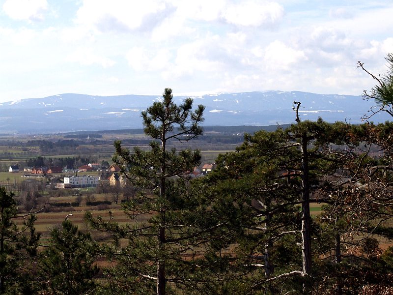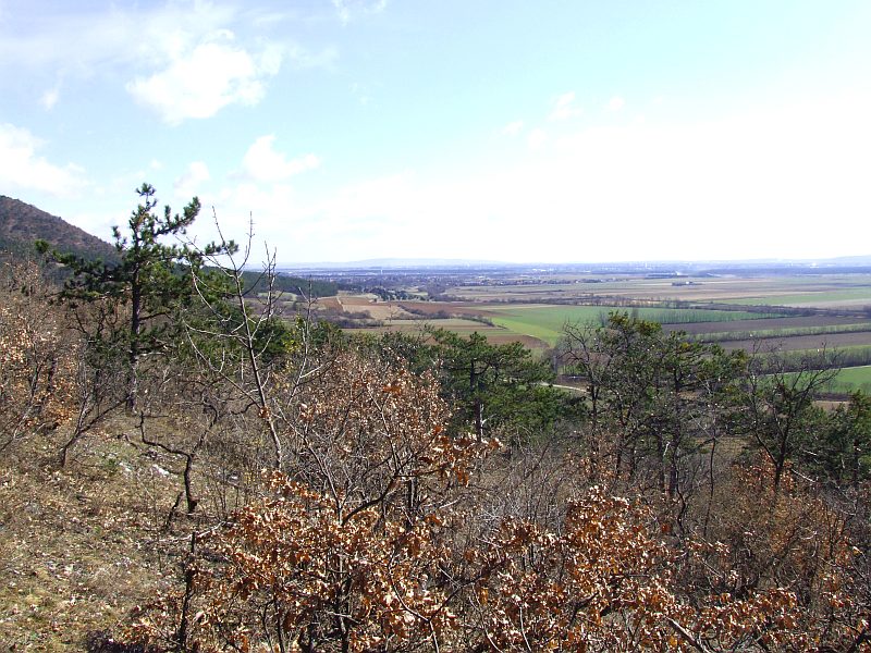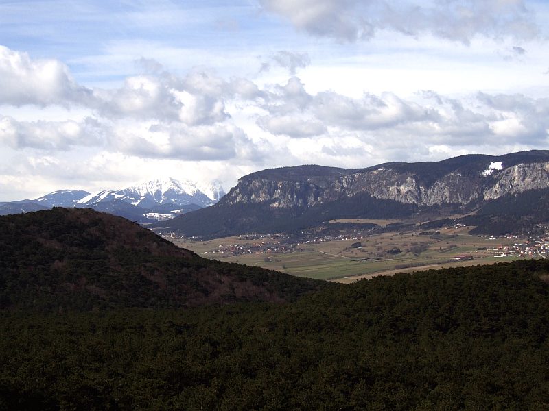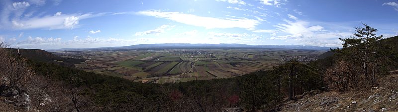 Durch den Wald bin ich auch so zum Marmorsteinbruch gelangt. Panoramablick über das südliche Wiener Becken, hinten das Rosaliengebirge, rechts Wechsel und Semmering. Hierher oder ins Bild klicken für eine größere Darstellung.