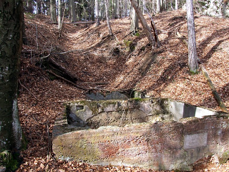 Ich steige zum Brunntal hinab. Im Wald sieht man einige alte Wasserauffangbecken. Darin sammelte man das hier nur spärlich vorhandene Wasser, um es im Marmorsteinbruch zum Kühlen der Umlaufseile, mit denen das Gestein vorsichtig herausgeschnitten wurde, zu verwenden.
