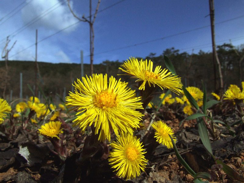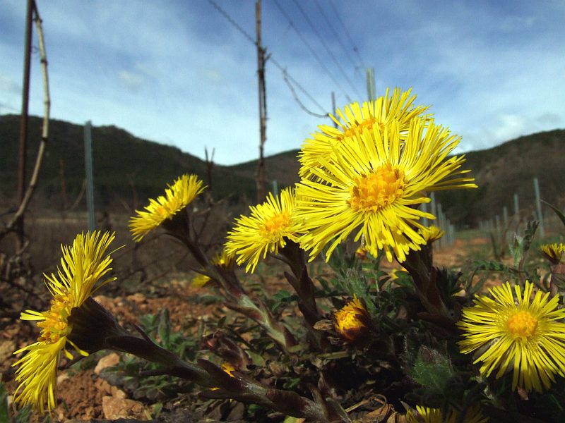 Weiter unten in einem neu angelegten Weingarten ein gelber Fleck - blühender Huflattich (Tussilago farfara).