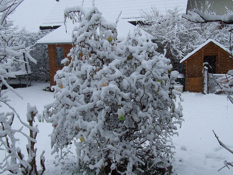 Die österliche Strauchdekoration verschwindet gerade im Schnee.
