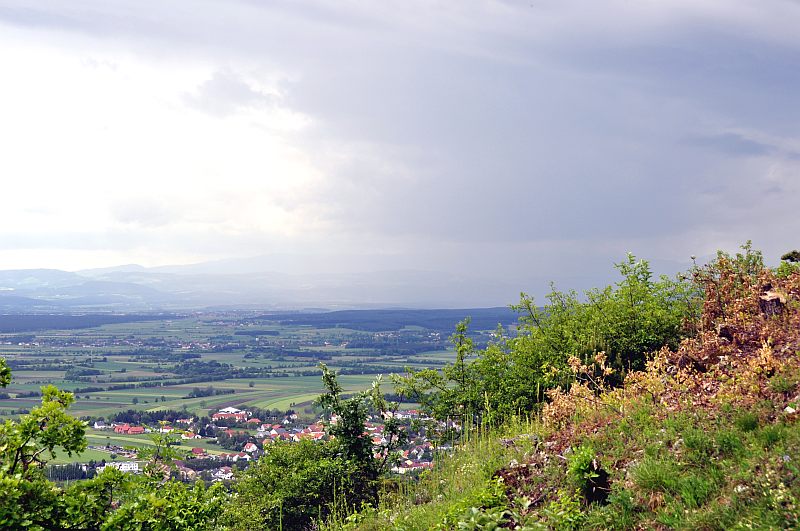 Wir wandern also im Gewitterregen noch eine Runde zum Grössenberg, zurück zur Ruine Emmerberg und genießen schließlich nach dem Regen die Aussicht auf Winzendorf vom Oberrand des großen Winzendorfer Kalksteinbruchs. Zu Hause ist Trockenlegen angesagt.