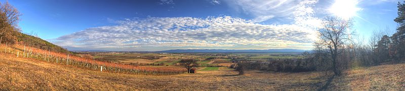 Panoramablick über die Weingärten, knapp oberhalb des Winzendorfer Ortsrandes. Hierher oder ins Bild klicken für eine größere Darstellung.