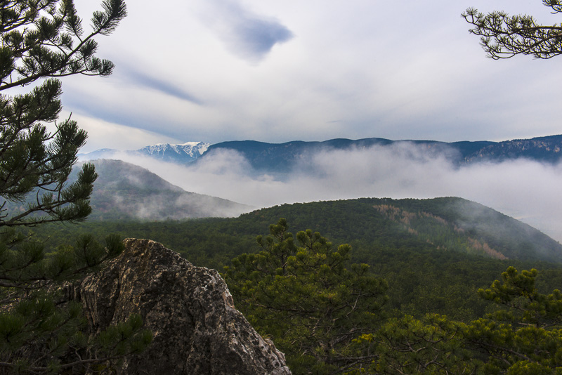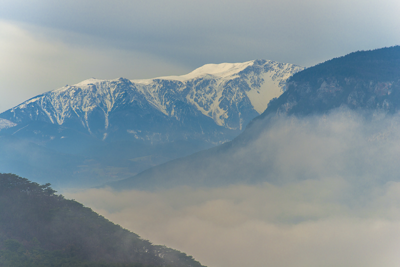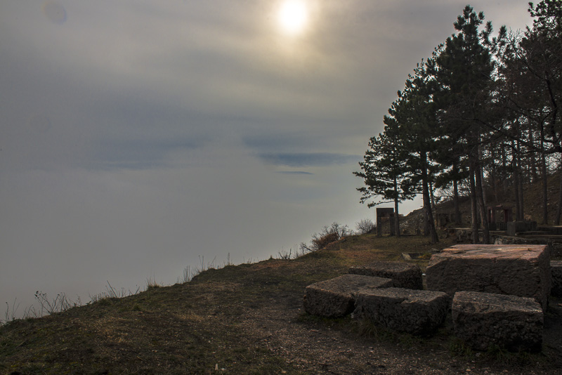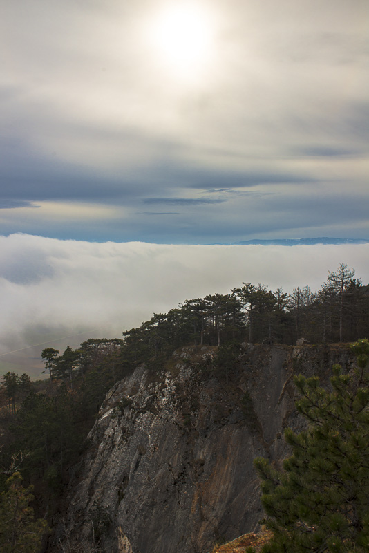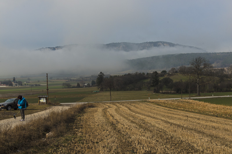 We walk up on the Engelsberg above the quarry to the view point with the bench and look to the mist hanging around the valley "Neue Welt" and to Schneeberg and Hohe Wand.