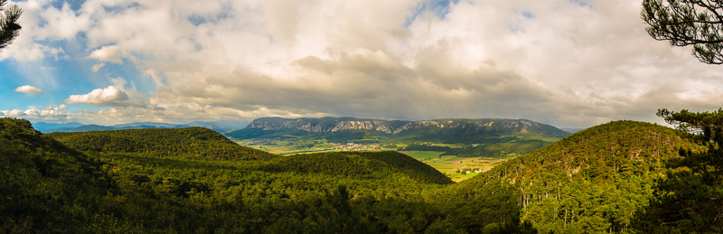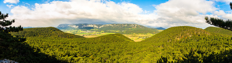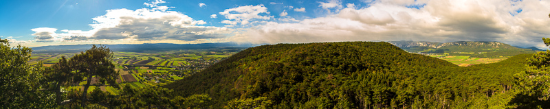 Panoramic view from the "Neue Welt View" to Hohe Wand. Schneeberg still in clouds. Click here or into the picture for a larger display.