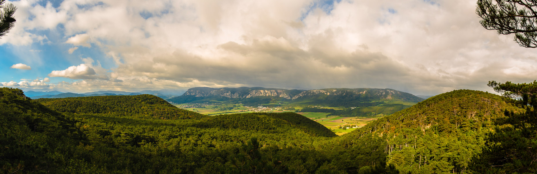 Panoramablick von der "Neue Welt - Aussicht" zur Hohen Wand. Der Schneeberg noch in Wolken.