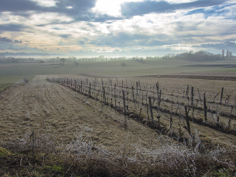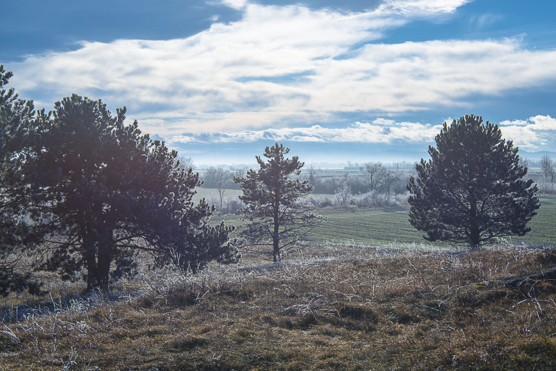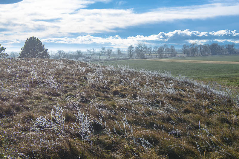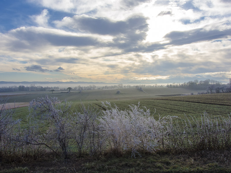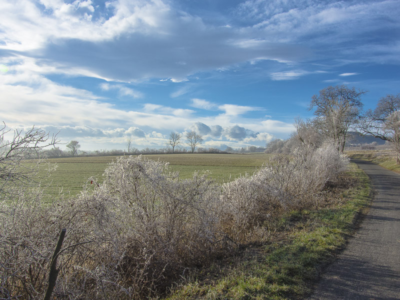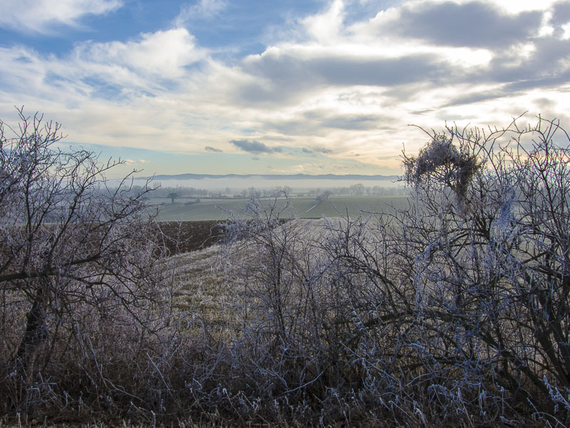 Too late, because the sun already has thawed much of the wonderful hoarfrost. The temperature is rising rapidly, and the emerging wind from south does the rest.