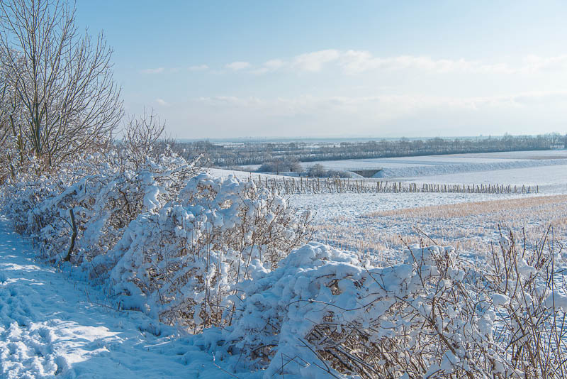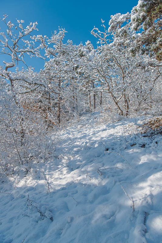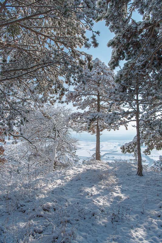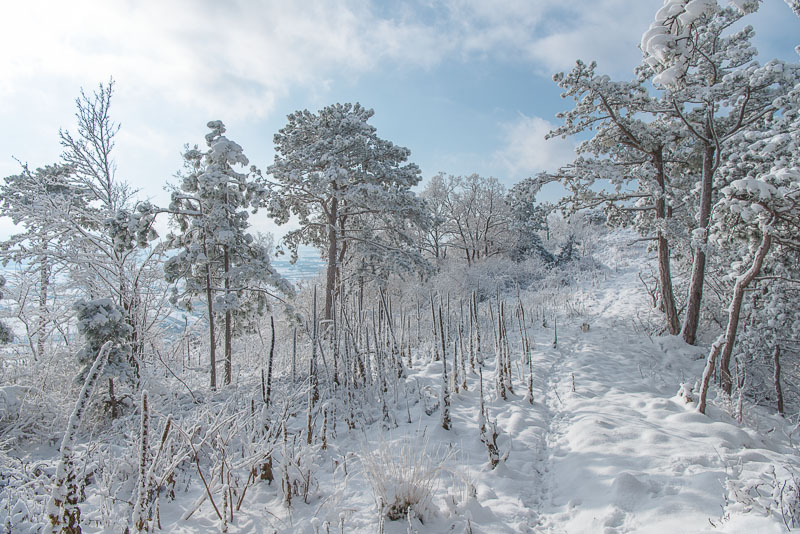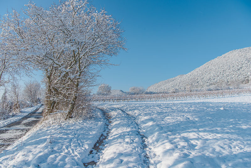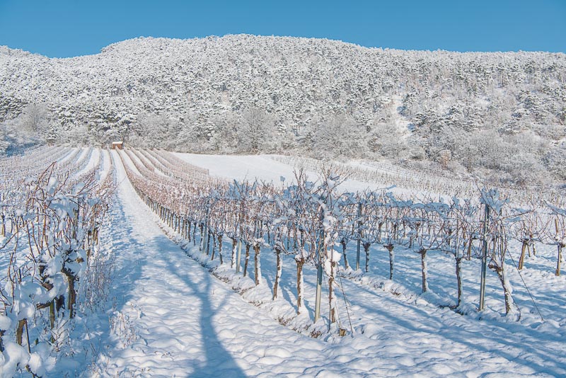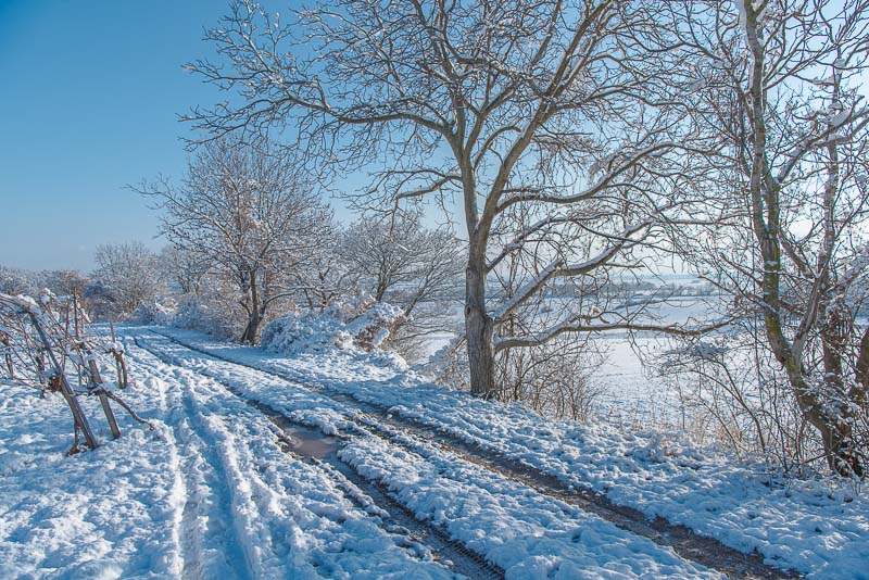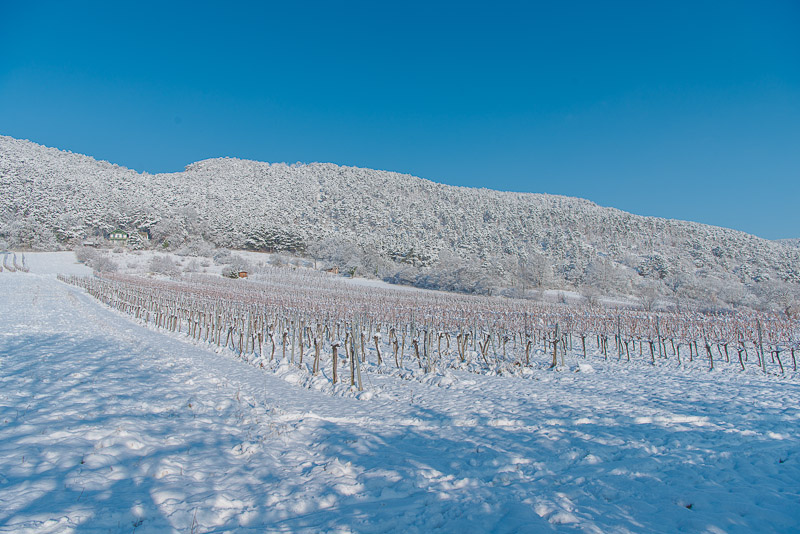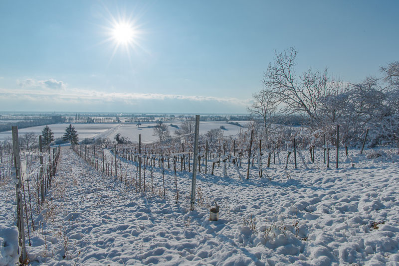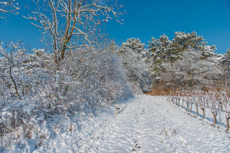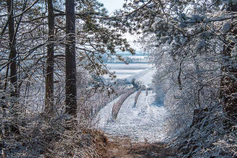 Eine winterliche Märchenlandschaft erwartet mich. Ich gehe zunächst durch die Weingärten ein Stück bergab.