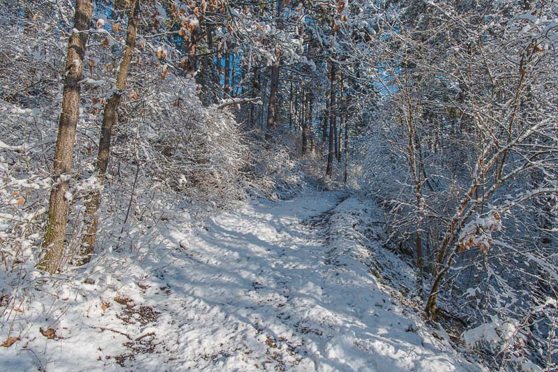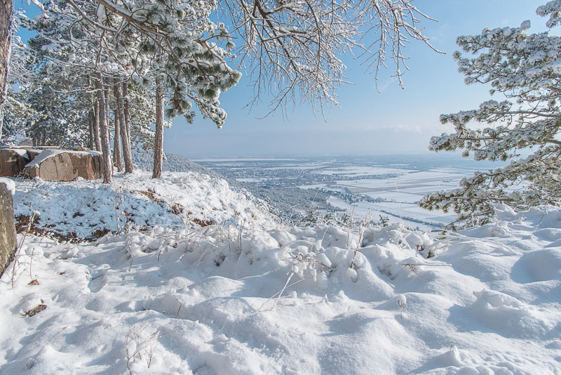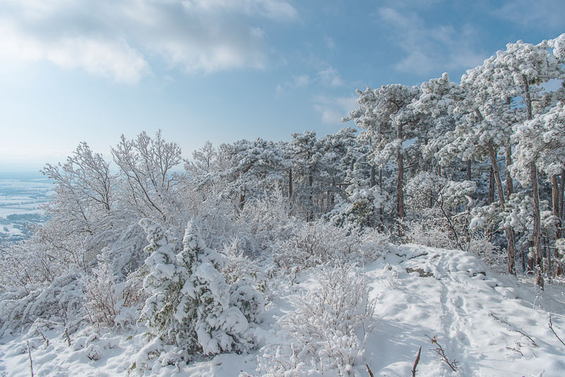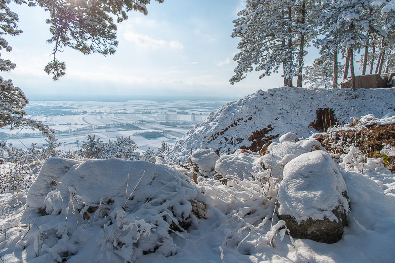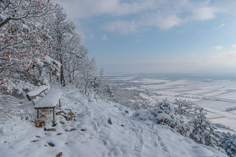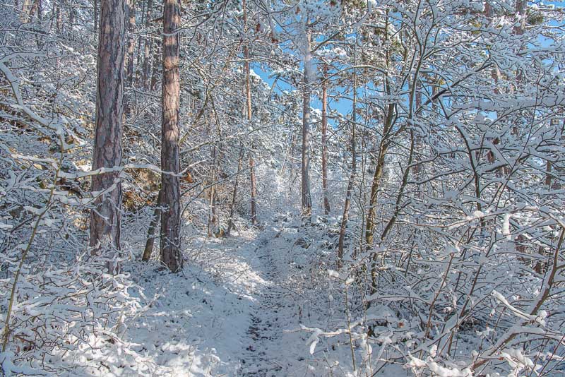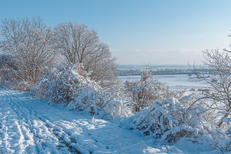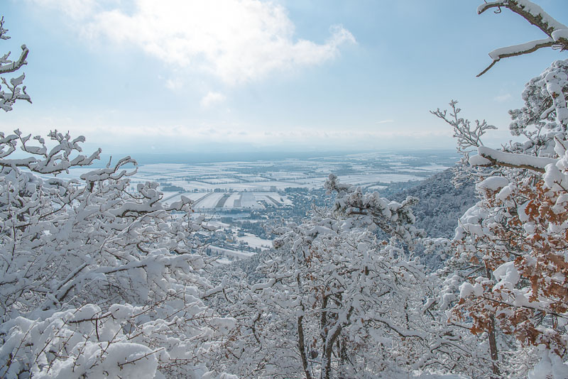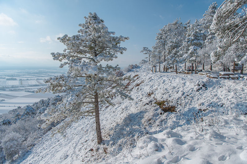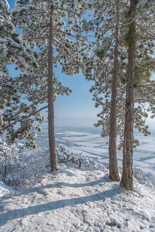 Eine winterliche Märchenlandschaft erwartet mich. Ich gehe zunächst durch die Weingärten ein Stück bergab.