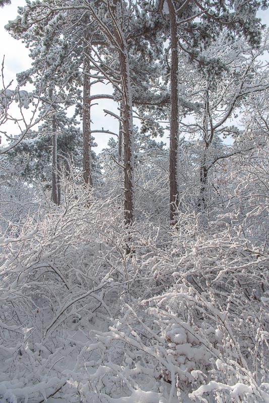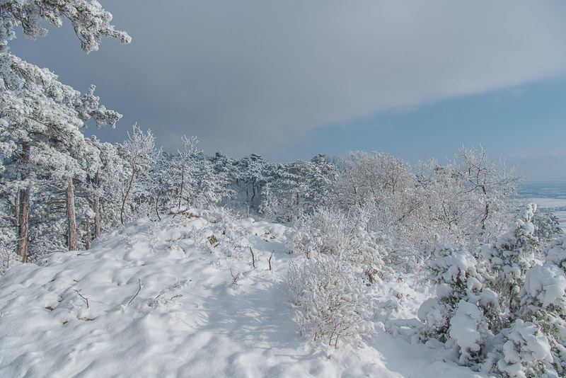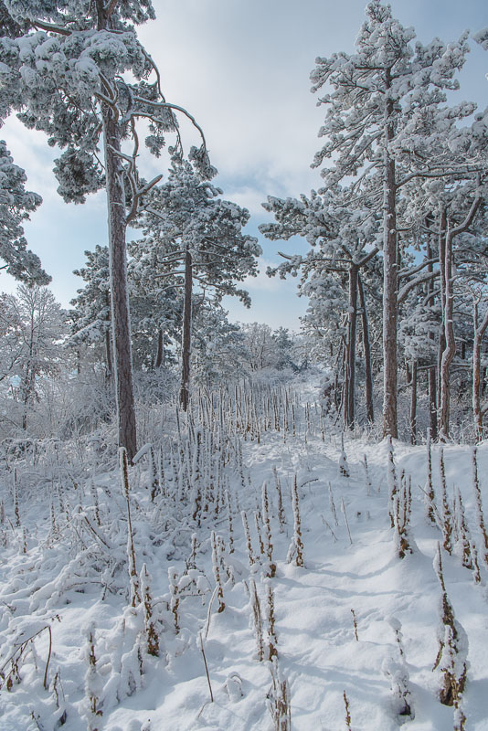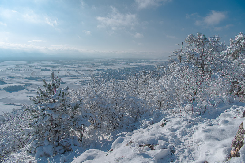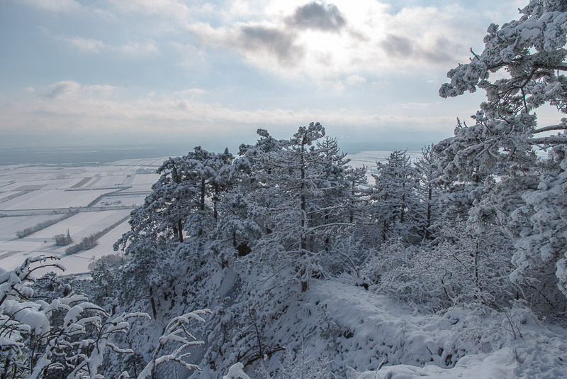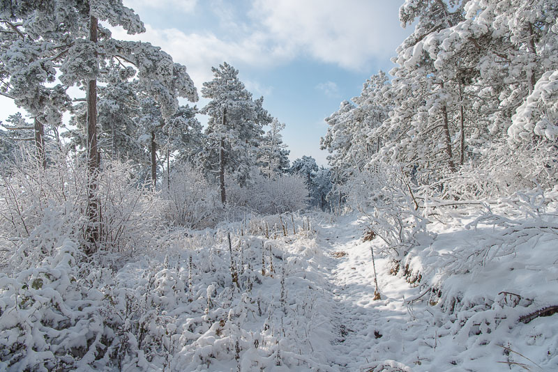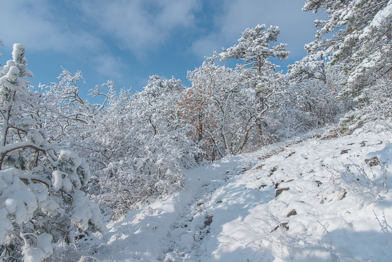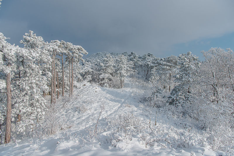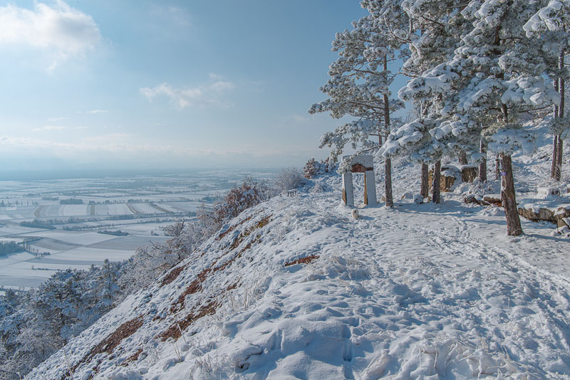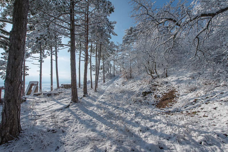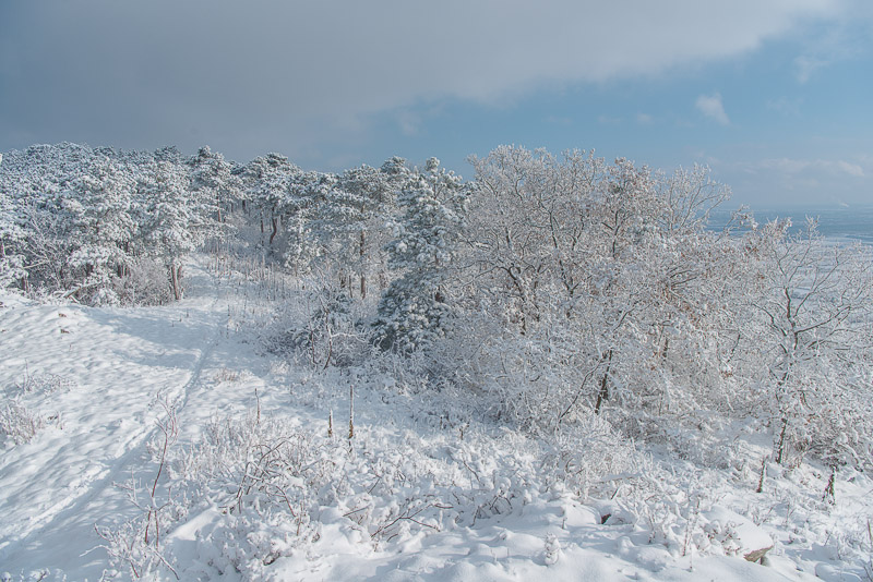 Eine winterliche Märchenlandschaft erwartet mich. Ich gehe zunächst durch die Weingärten ein Stück bergab.