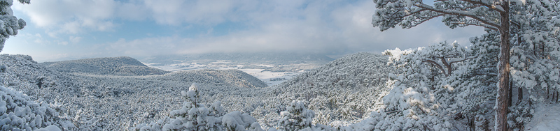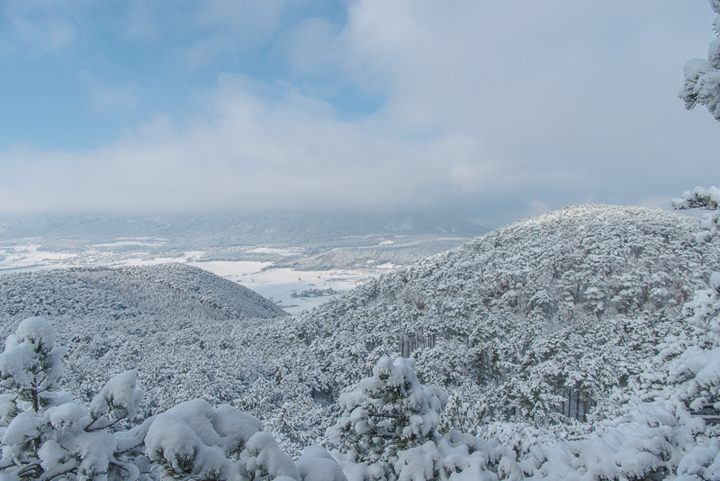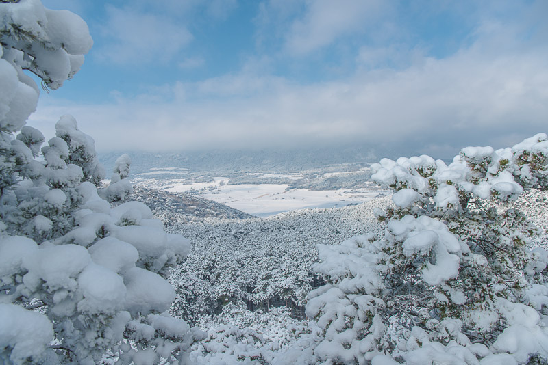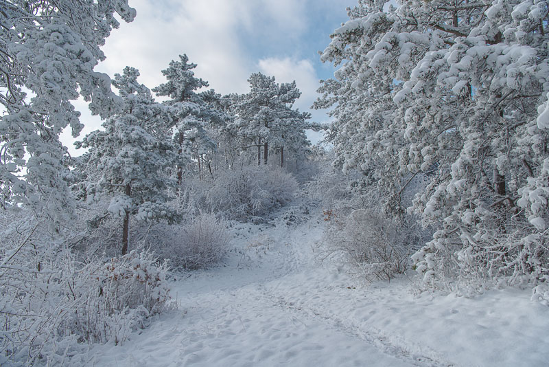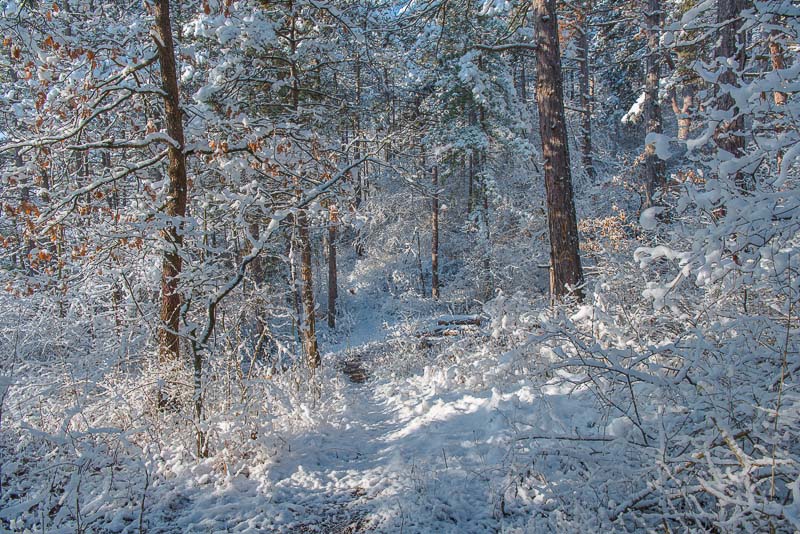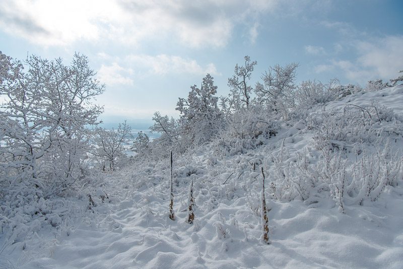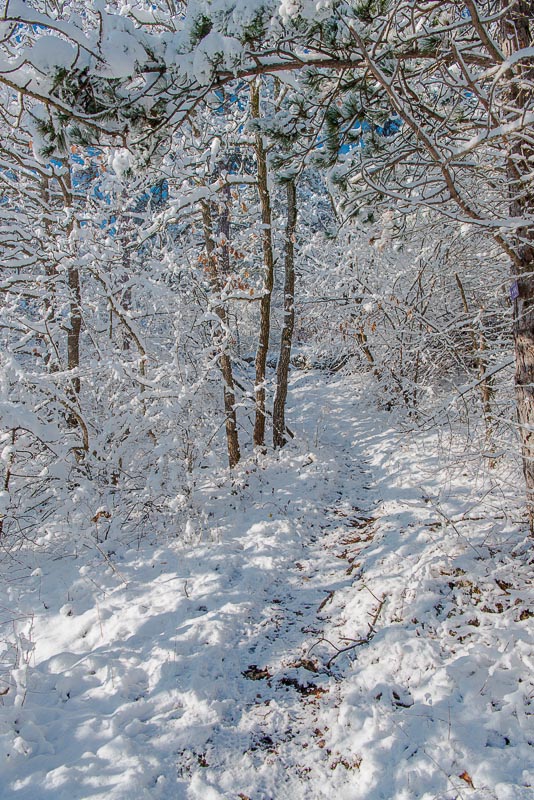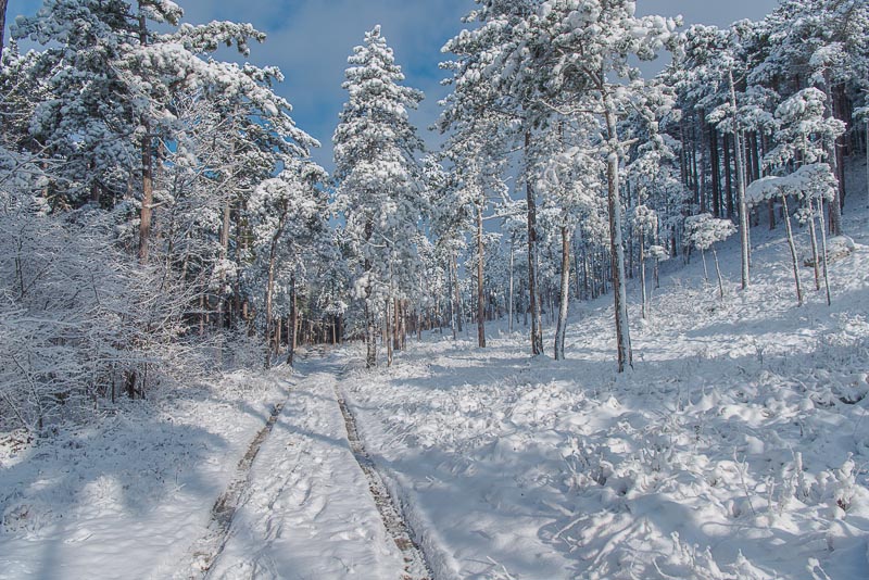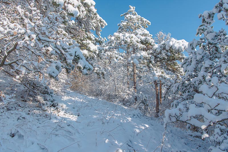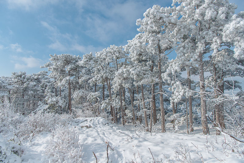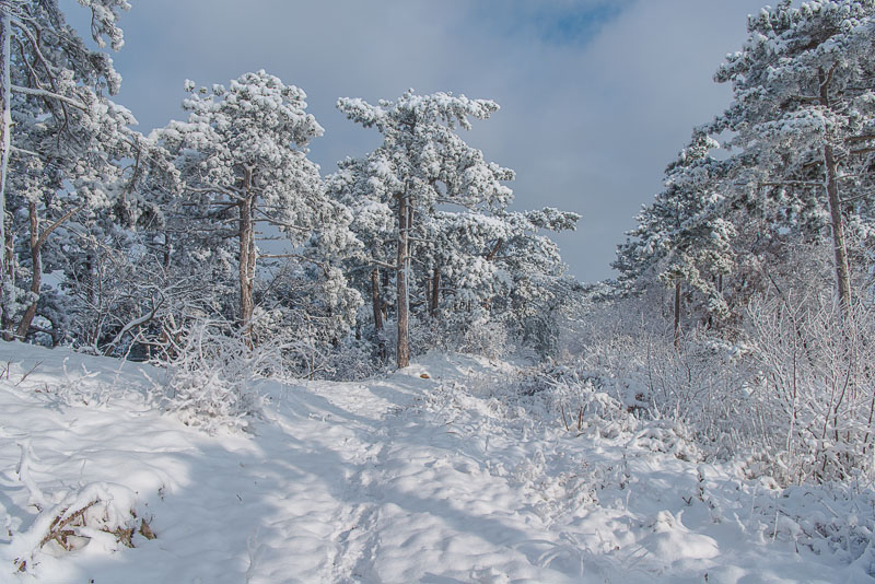 Eine winterliche Märchenlandschaft erwartet mich. Ich gehe zunächst durch die Weingärten ein Stück bergab.