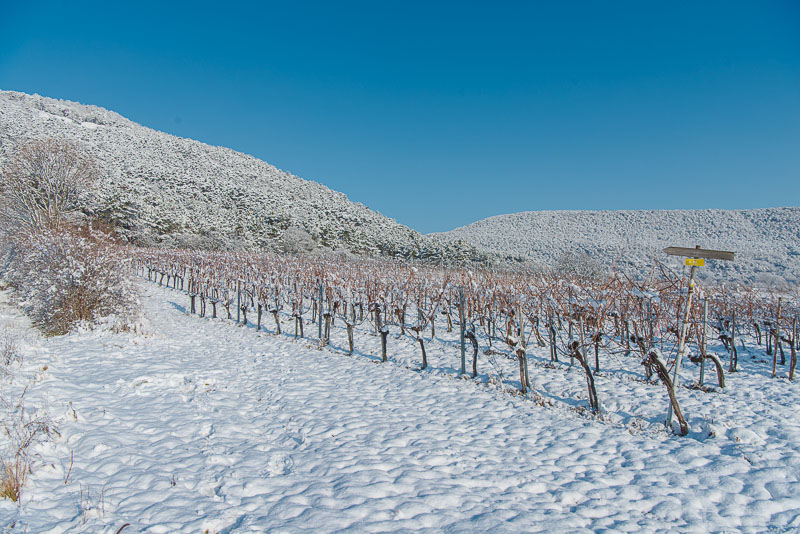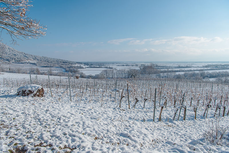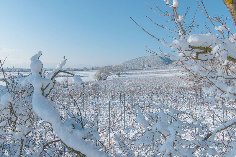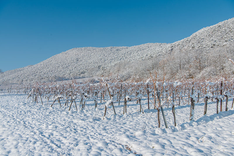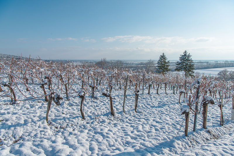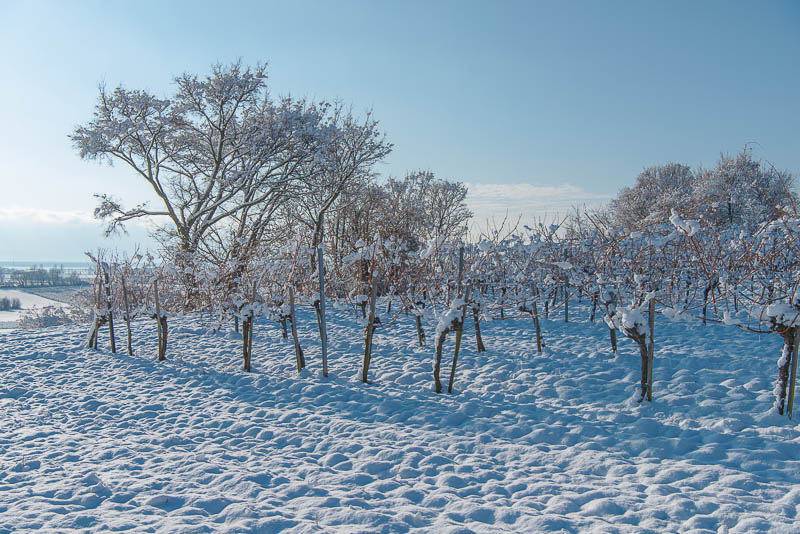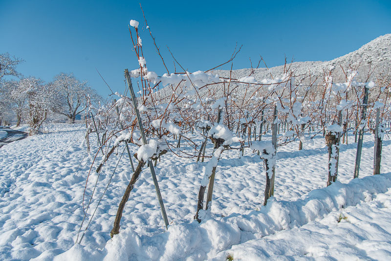 Scheinbar war kaum Wind, wie es geschneit hat, sodass Schnee auf den Weinstöcken liegen geblieben ist.