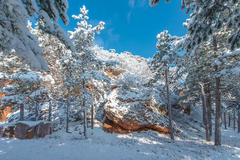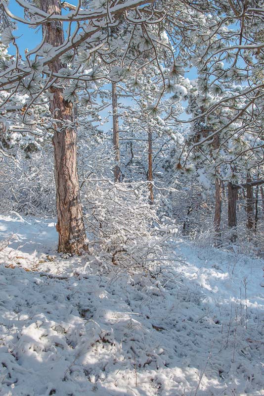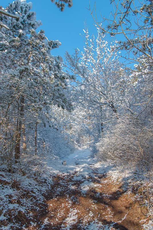 Am Wochenende hat es geschneit. Heute erwache ich mit dem Blick auf strahlenden Sonnenschein und tief verschneiten Föhrenwald. Nach dem Frühstück geht es daher sofort mit Lucy hinaus in den Schnee.
