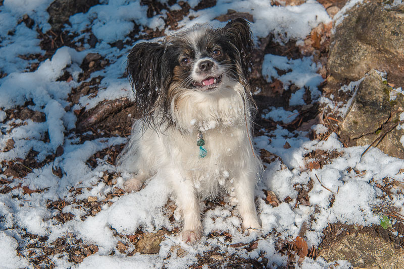 Lucy bellt mich an, weil sie will, dass ich einen Föhrenzapfen werfe, dem sie dann hinterherrasen kann. Heute ist ein frustrierender Tag für sie, weil sie den Großteil der geworfenen "Bockerl" im Schnee nicht finden kann.