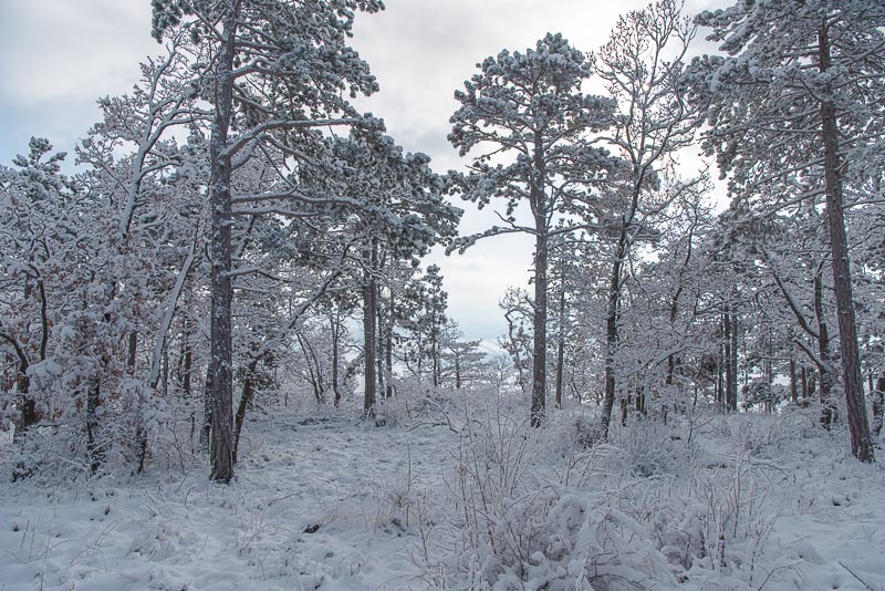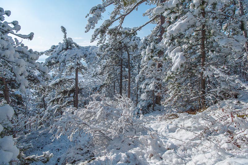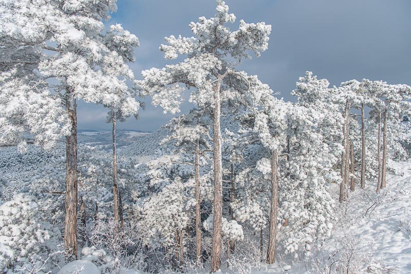 Tief verschneite Föhren am Kamm des Engelsberges.