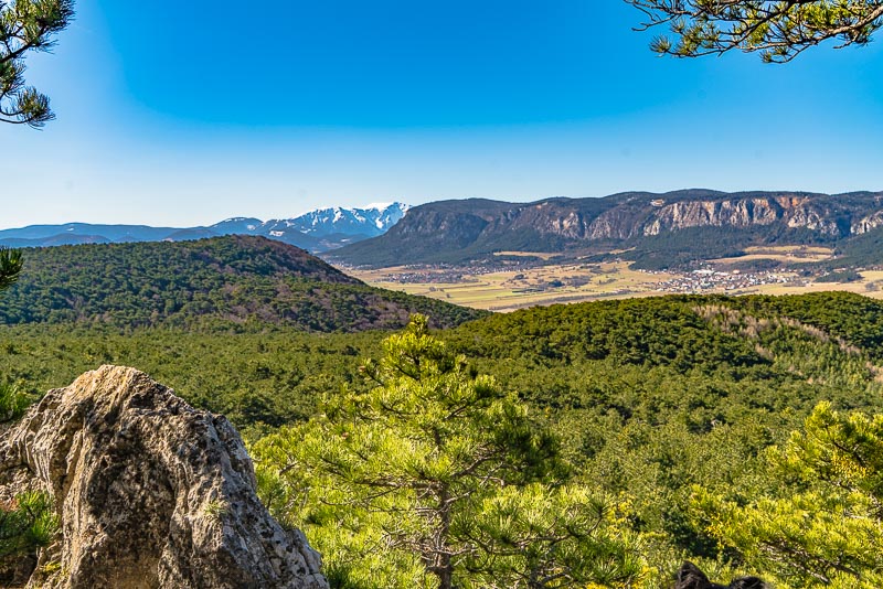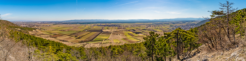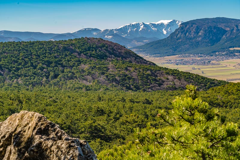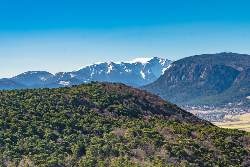 Blick vom Engelsberg zum Schneeberg und zur Hohen Wand. Vorne der Schlossberg.