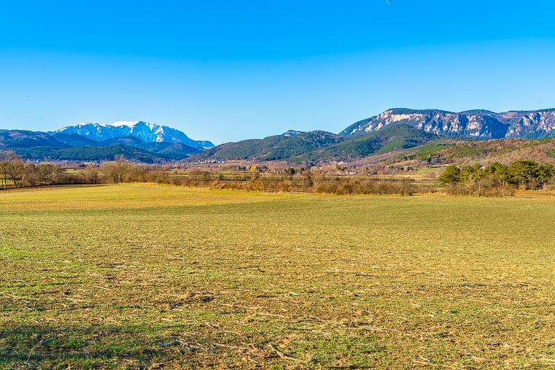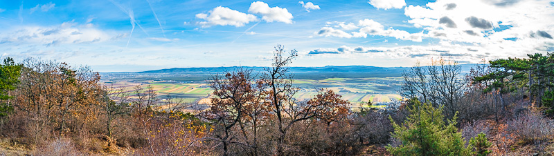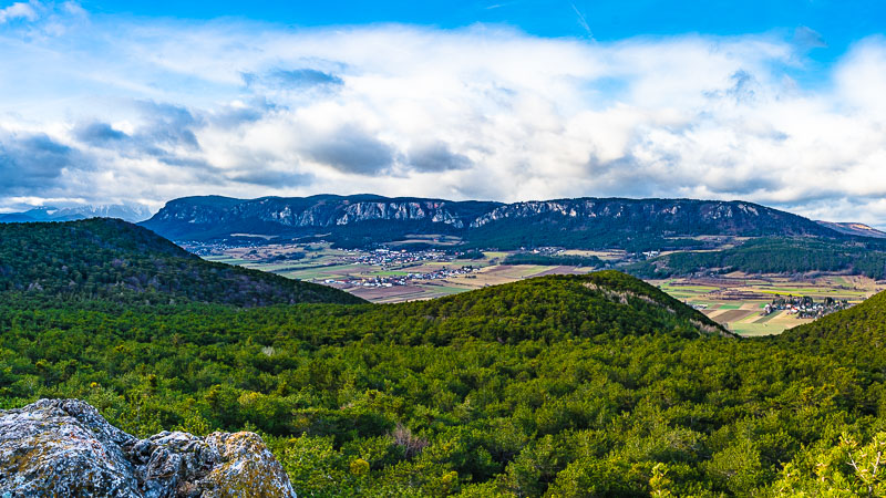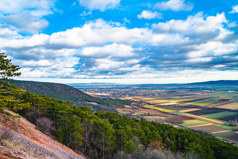 Blick vom Marmorsteinbruch über das Steinfeld zur Rosalia, ganz rechts Winzendorf (Hierher oder ins Bild klicken für eine größere Darstellung) ..