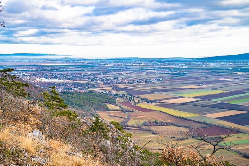 Am oberen Rand der Steinbruchwand geht der Blick nach Bad Fischau und Wiener Neustadt