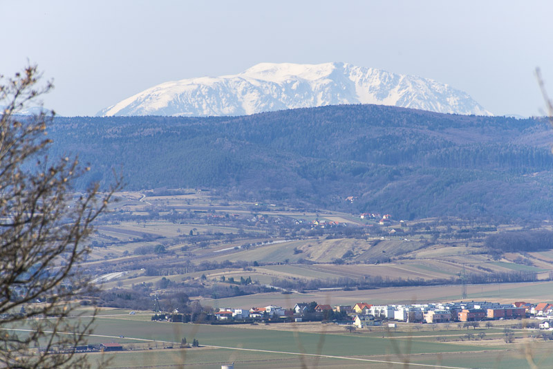 View over Rohrbach to the Rosalia mountains with Schneeberg behind, far left a narrow glimpse of the Rax.