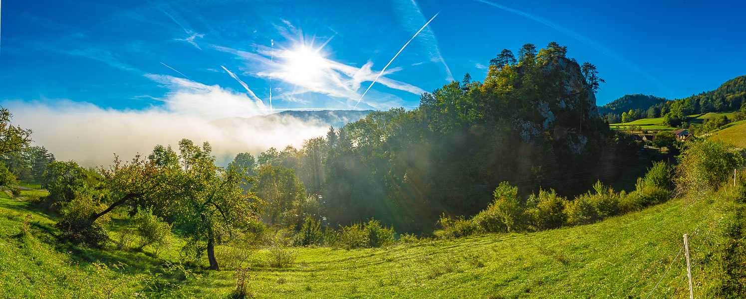 Panorama vom Miesenbacher Ortsteil Frohnberg mit Blick zur Hohen Wand. Rechts der Felszacken des gleichnamigen Frohnbergs.