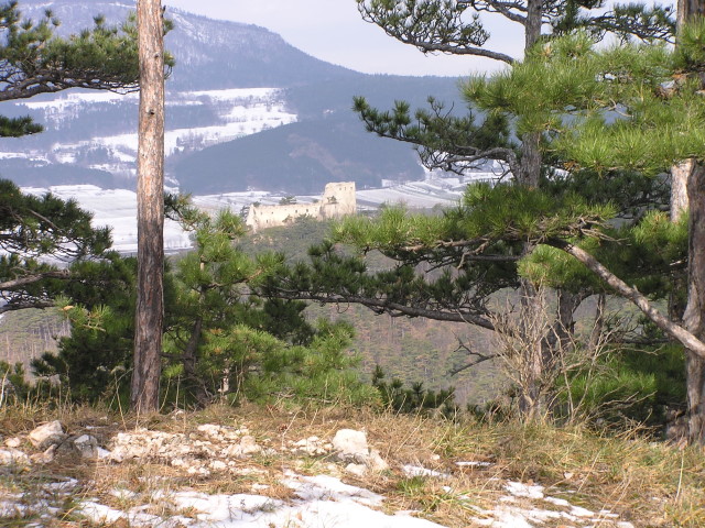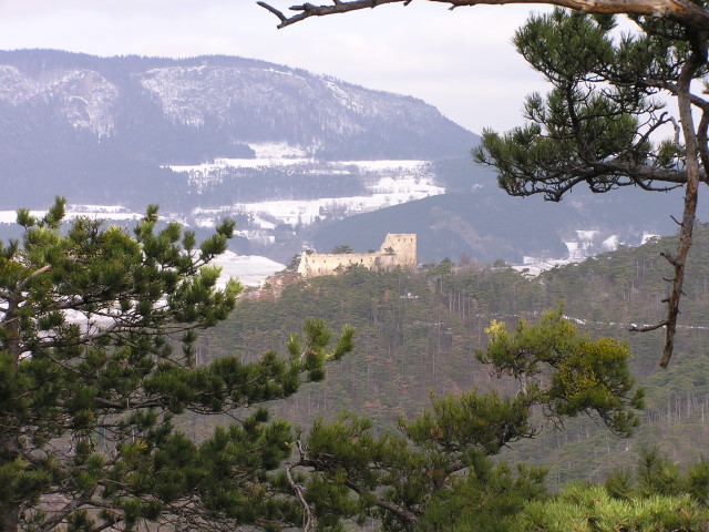Ascent through black pine forest. View to ruined castle Emmerberg and Hohe Wand
