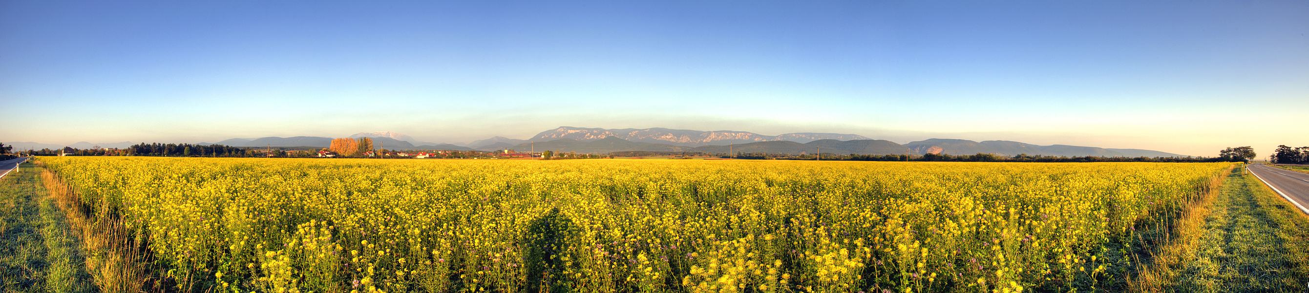HDR - 180° - Panorama, von der Blätterstraße aus gesehen. Ganz links Wechsel- und Semmeringgebiet, Schneeberg, Hohe Wand, Fischauer Vorberge.