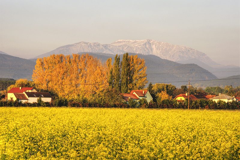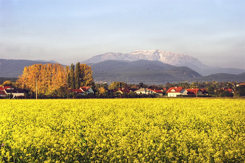 Neusiedl with poplars surrounding the fishing pond, and Schneeberg