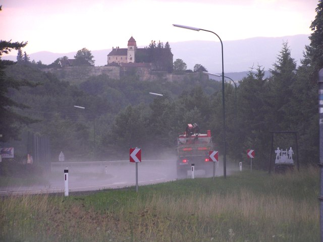 Arrived in Bernstein - View on the castle from the road to Redlschlag.