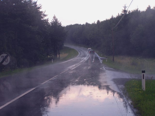 Haze lifts from the road that was heatened before and soaked afterwards.