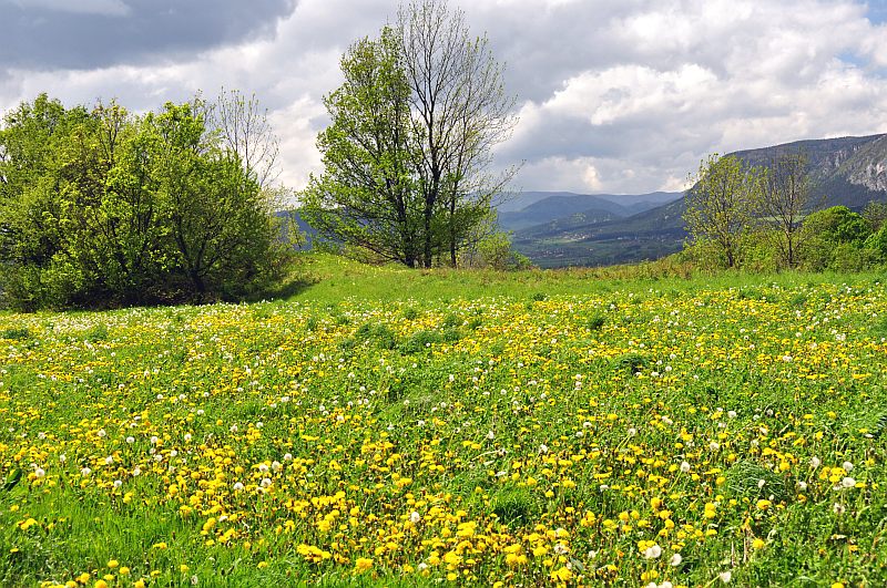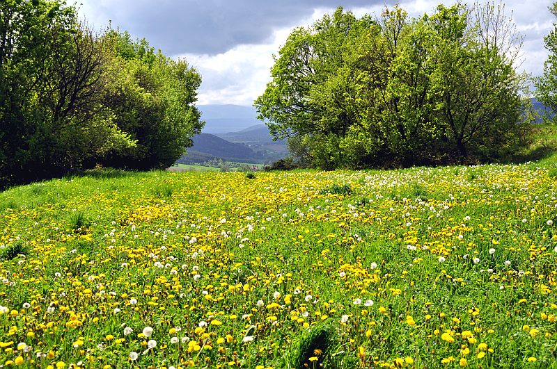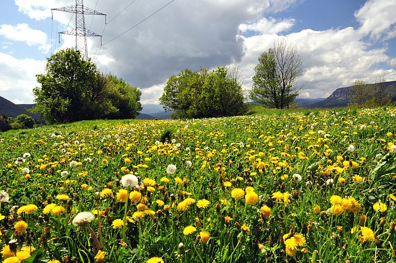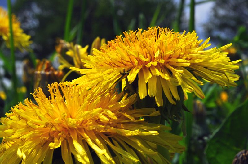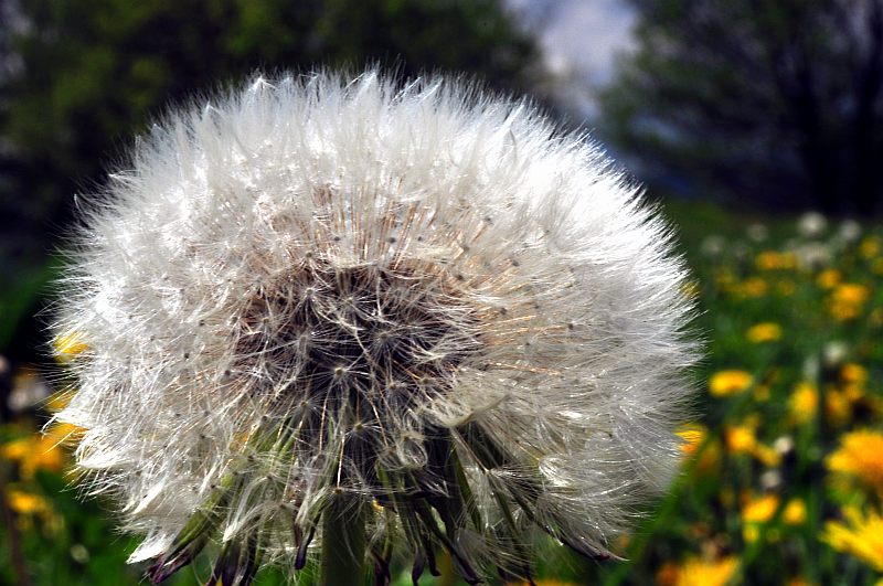 Dandelions already a bit withered, with lots of seeds intermingled.