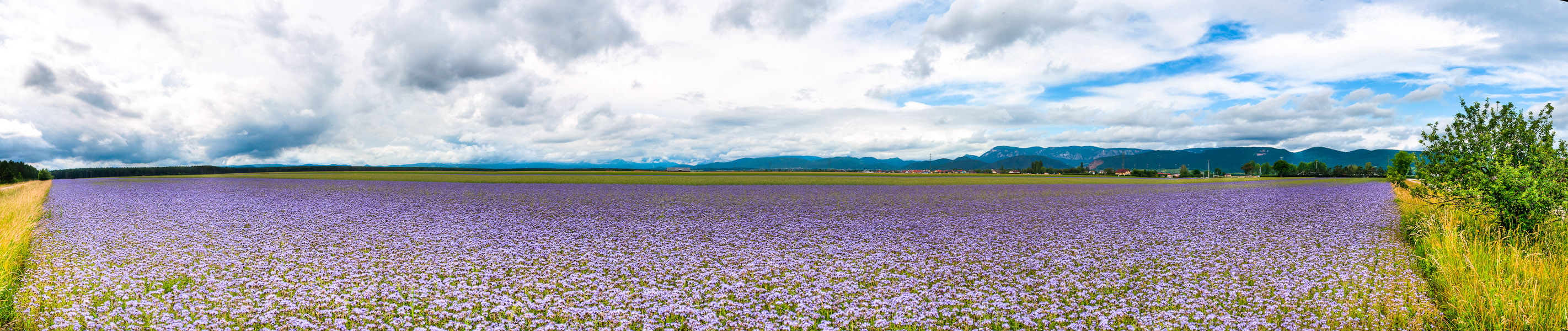 180 Grad Panoramabild des Phacelia - Feldes. Rechts im Hintergrund Weikersdorf.
