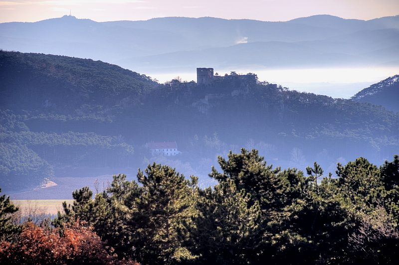An unusual view to ruin Emmerberg, with the Rosalia chapel in the far distance.