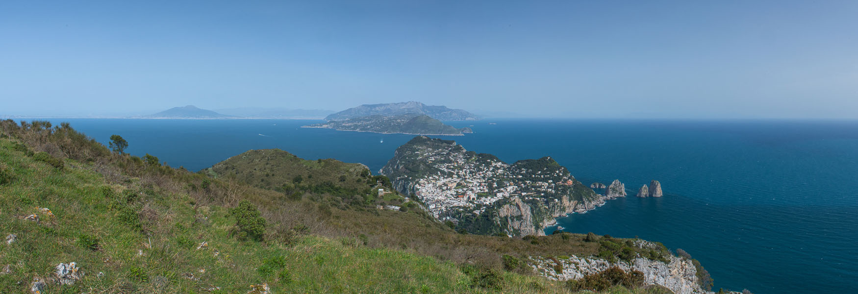Panoramablick vom Monte Solaro nach Capri Stadt, dahinter die Halbinsel Sorrent, links der Vesuv.