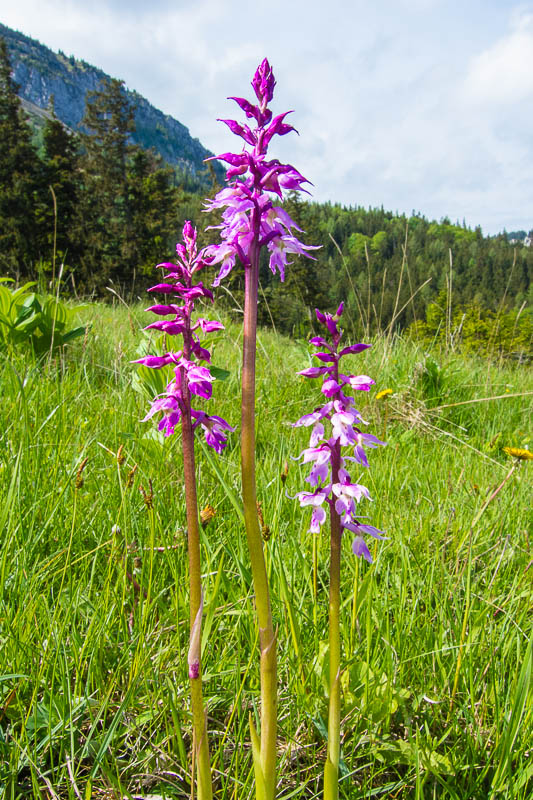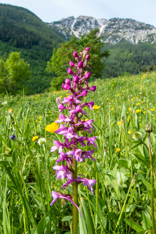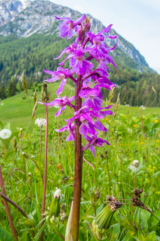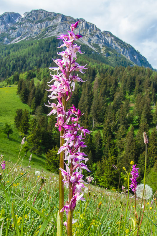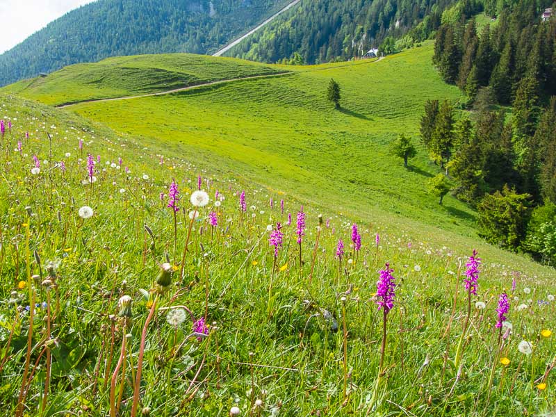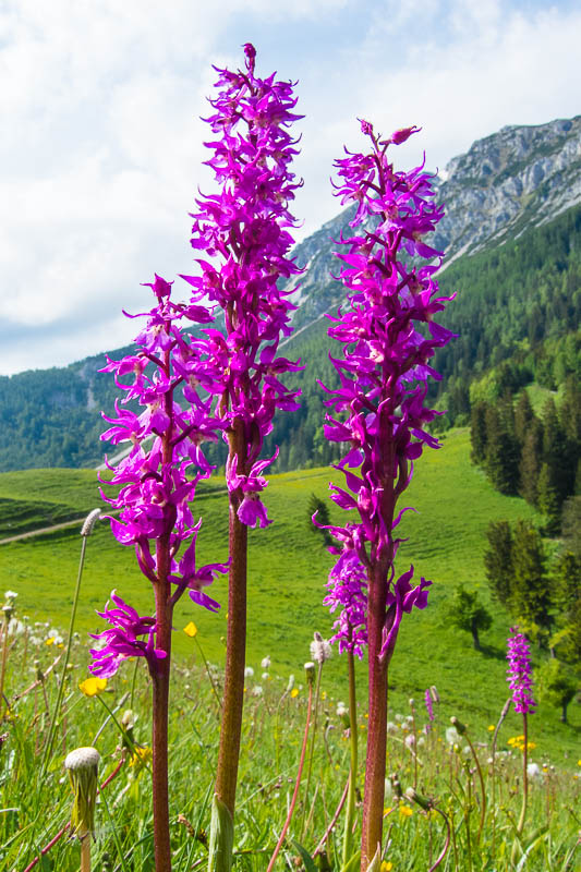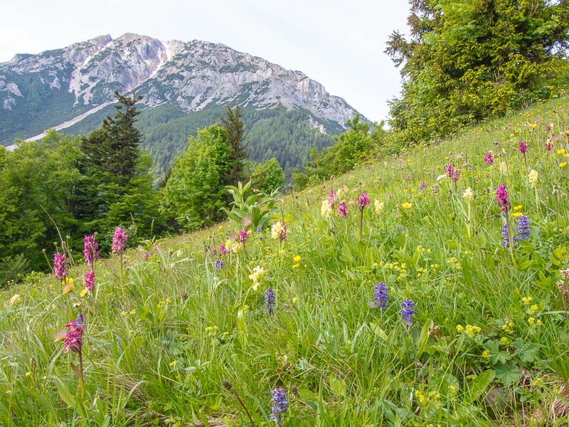 Early purple orchids (Orchis mascula) behind the Almreserlhaus. Edelweißhütte in the background.