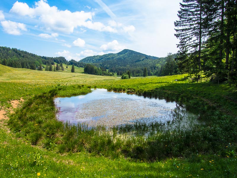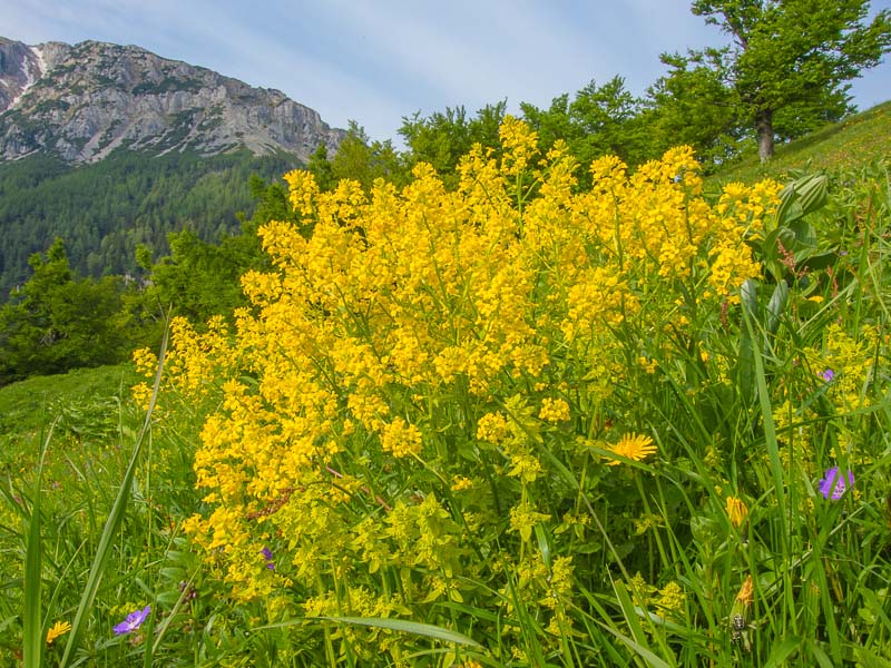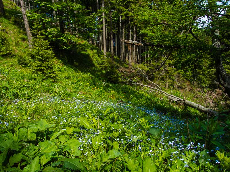 We walk down to the Putzkapelle without success in finding lady´s slipper orchids. On the forest road, we tunr to the east and walk along the slopes till we rech the large meadow called Mamauwiese. Schober in the backgound.