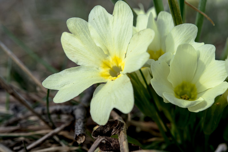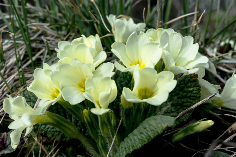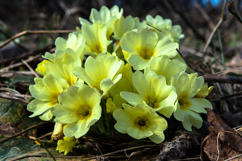 Near a row of trees lots of primroses (Primula vulgaris).
