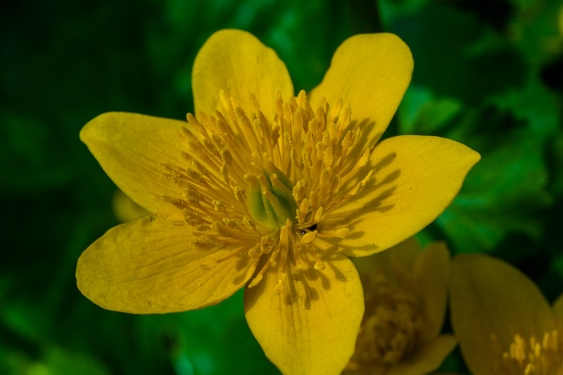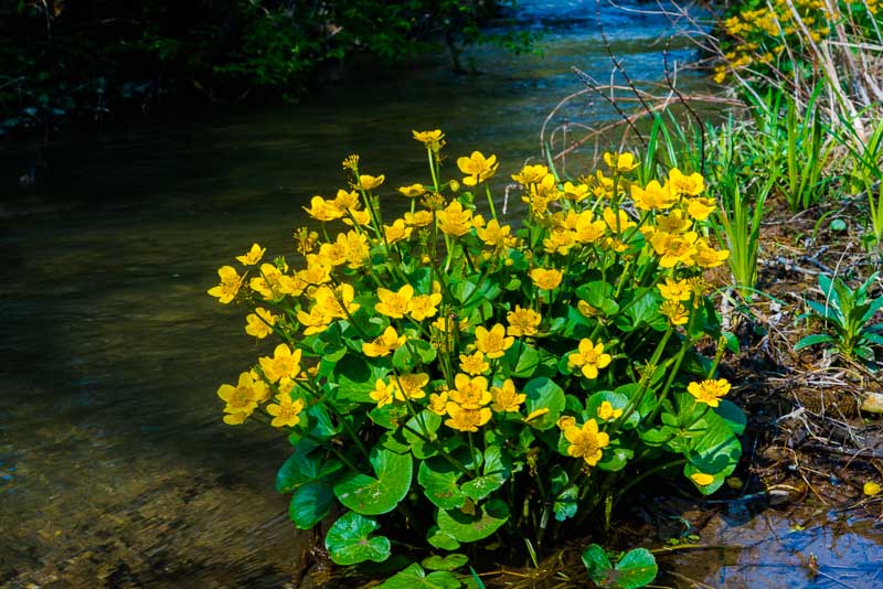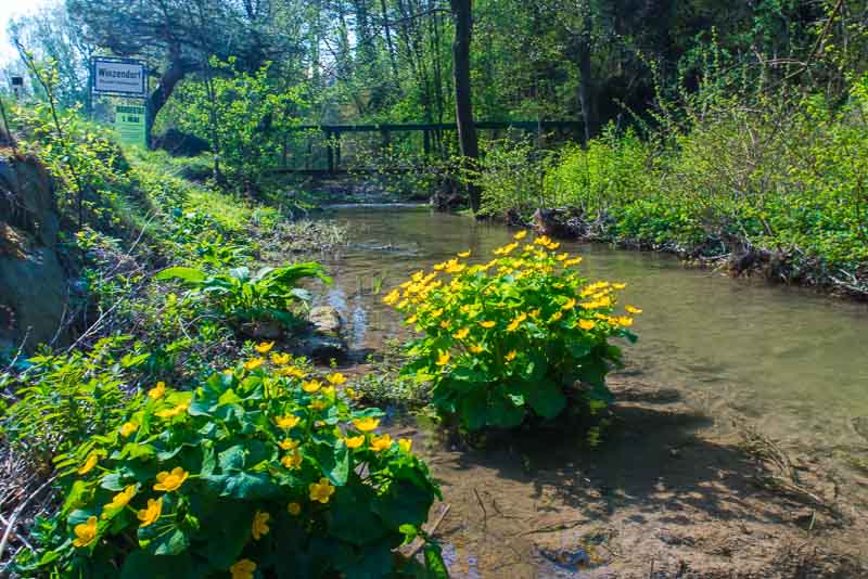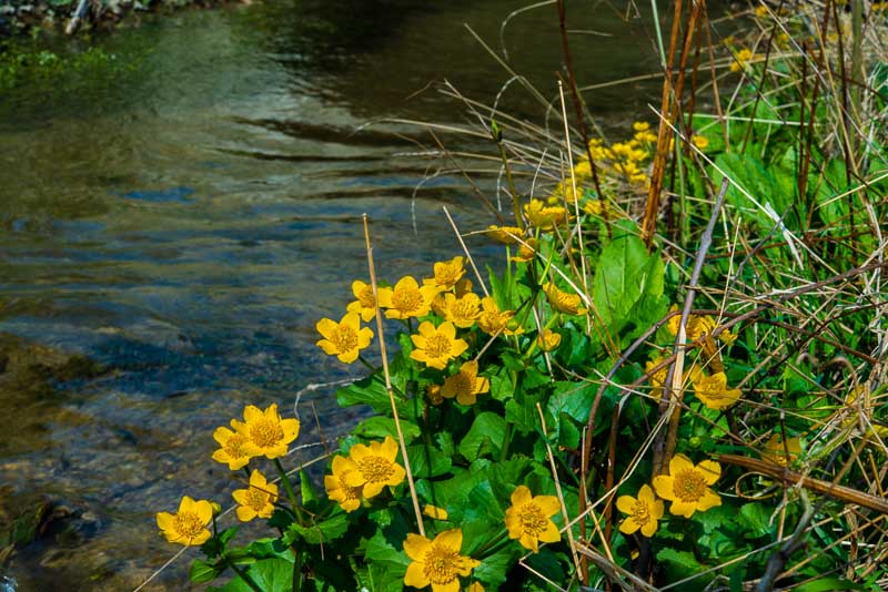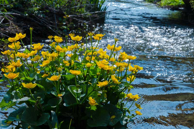 ... findet man diese Sumpfdotterblumen mitten im Bach, der dort etwas flacher ist. Daneben im Bach ein Holzstamm, der perfekte Platz für den linken Fuß des Fotografen ...