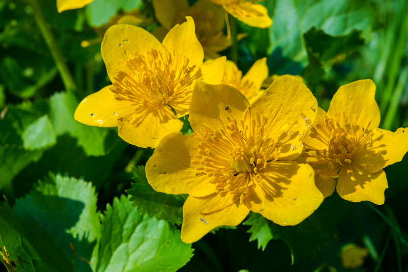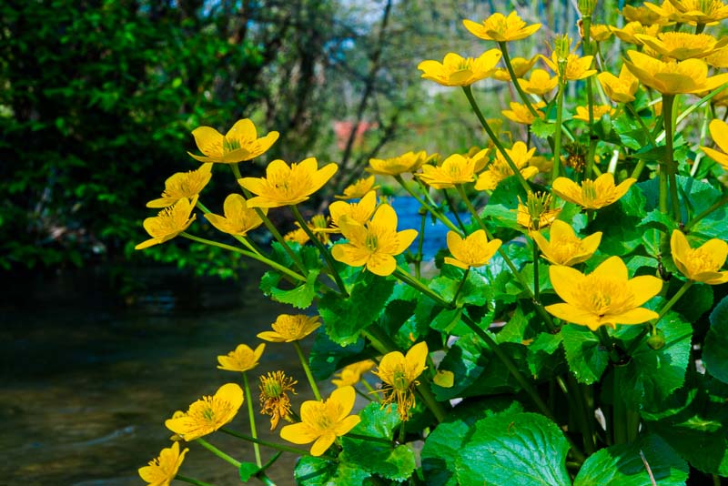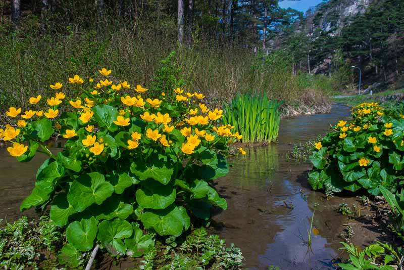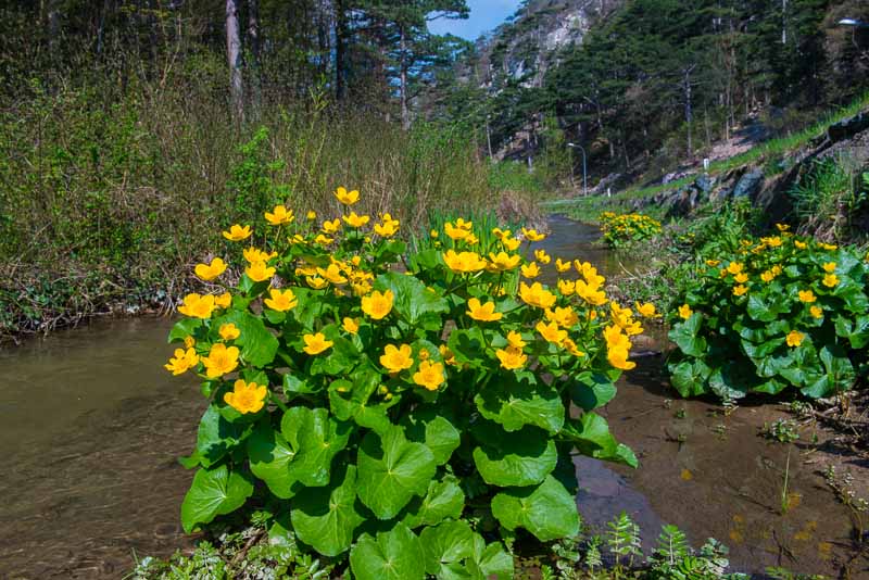 Ich habe mein Auto wieder und fahre durch die Prossetschlucht. Schon bei der Hinfahrt sind mir die wunderschönen Sumpfdotterblumen (Caltha palustris) aufgefallen.
